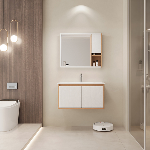 YIDA özel Modern banyo makyaj dolabı şık duvara monte tasarım parlak ahşap renk seramik lavabo daire sahip