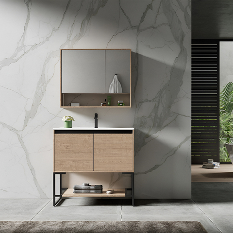 YIDA özel Modern kontrplak ahşap Vanity seramik lavabo lavabo banyo dolapları bakır ayna melamin kurulu hastaneler
